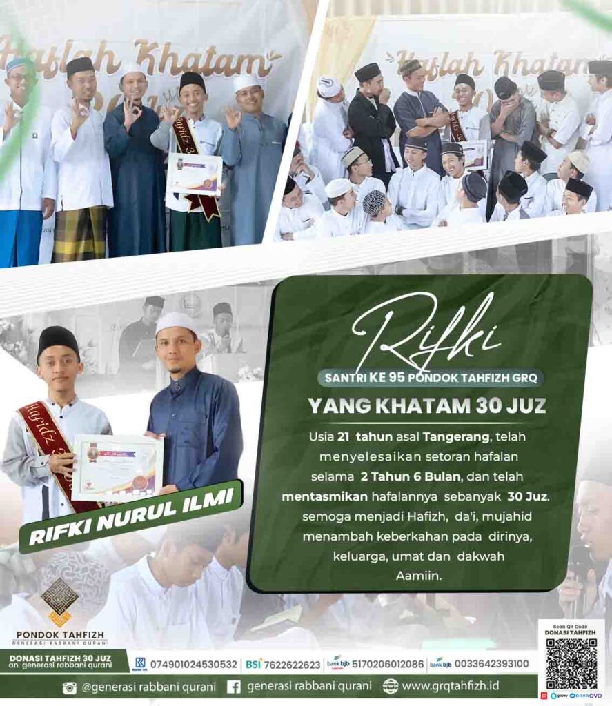Ma Sya Allah, Pondok tahfizh GRQ kembali lahirkan Hafizh qur’an ke 95, kali ini giliran santri Asal tangerang ( ananda RIfki Nurul Ilmi ) yang sukses menuntaskan setoran hafalnnya selama 2 tahun 6 bulan, bukan hanya setor hafalan saja, namun ananda juga telah mentasmikan hafalannya 25 juz dengan mutqin, Ma Sya Allah Barakallah.