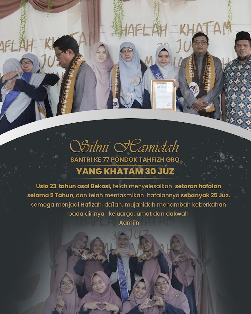 telah menyetorkan hafalan terakhirnya dalam HAFLAH MUBAROKAH KHATAM 30 JUZ (santri ke 77 & 78 yang KHATAM dalam PROGRAM TAHFIZH 30 JUZ )